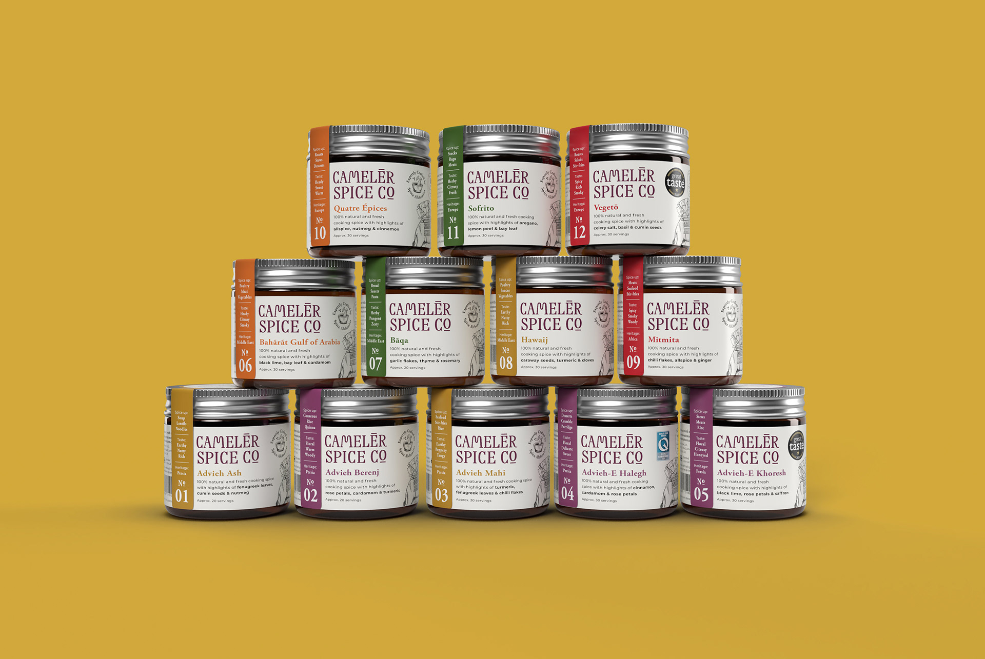 Cameler Spice Co. is passionate about sourcing spices from around the globe. The brand name is inspired by the old merchants and camels who brought spices between continents. I wanted to ensure that this inspiration and heritage was communicated through the branding. More importantly, the labels needed to better highlight the blendsʼ value to the consumer – in terms of flavour, uses and recipe ideas. I established brand architecture and instated a colour-coded system, plus heritage marks and a flexible way to present the key information.