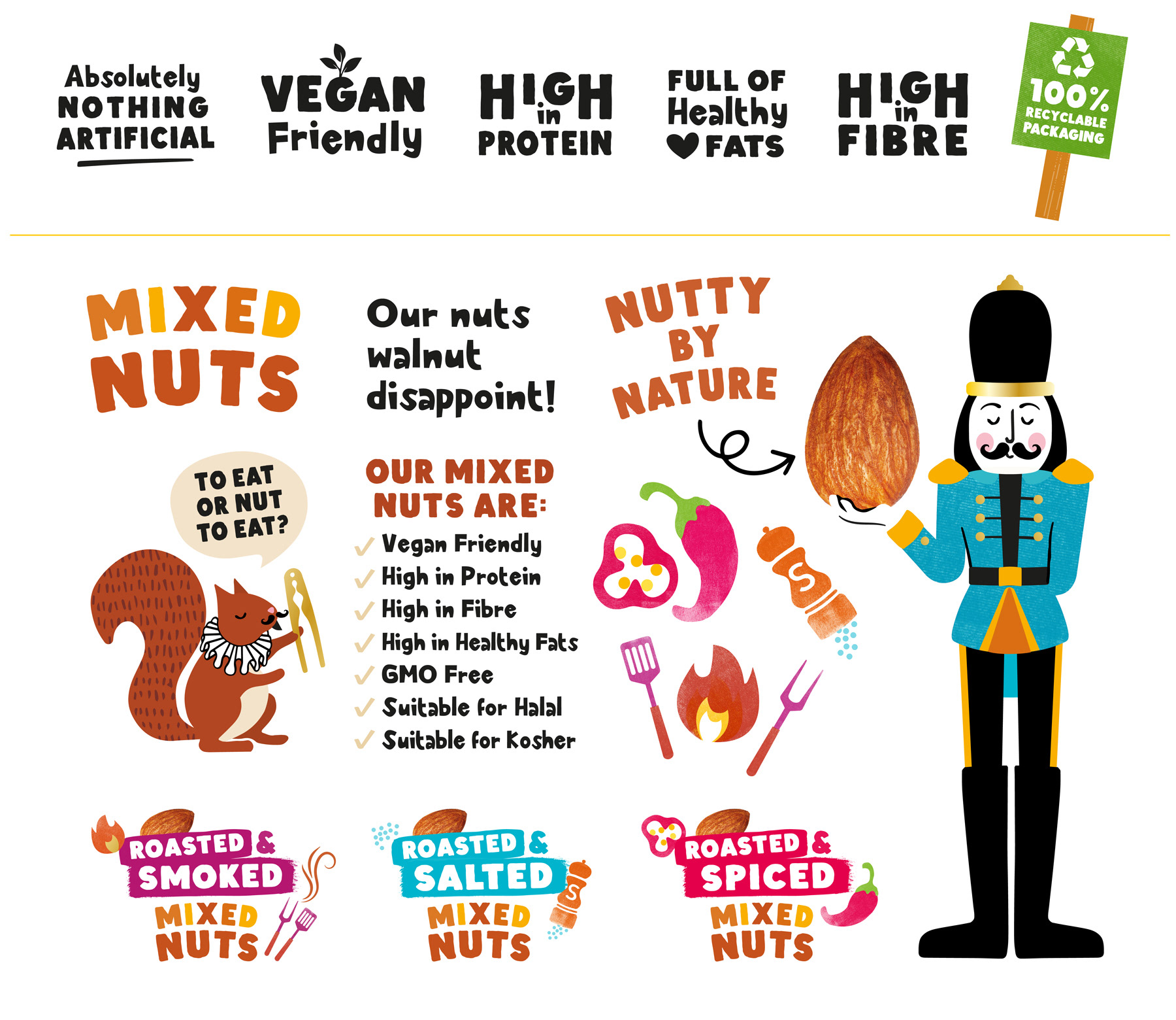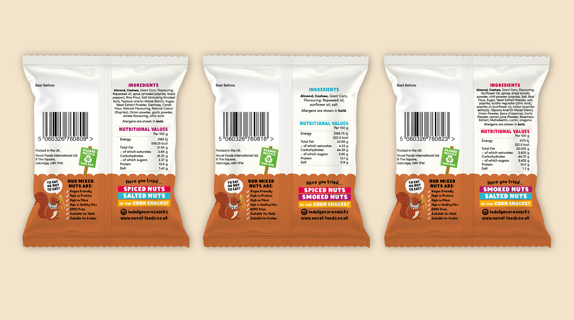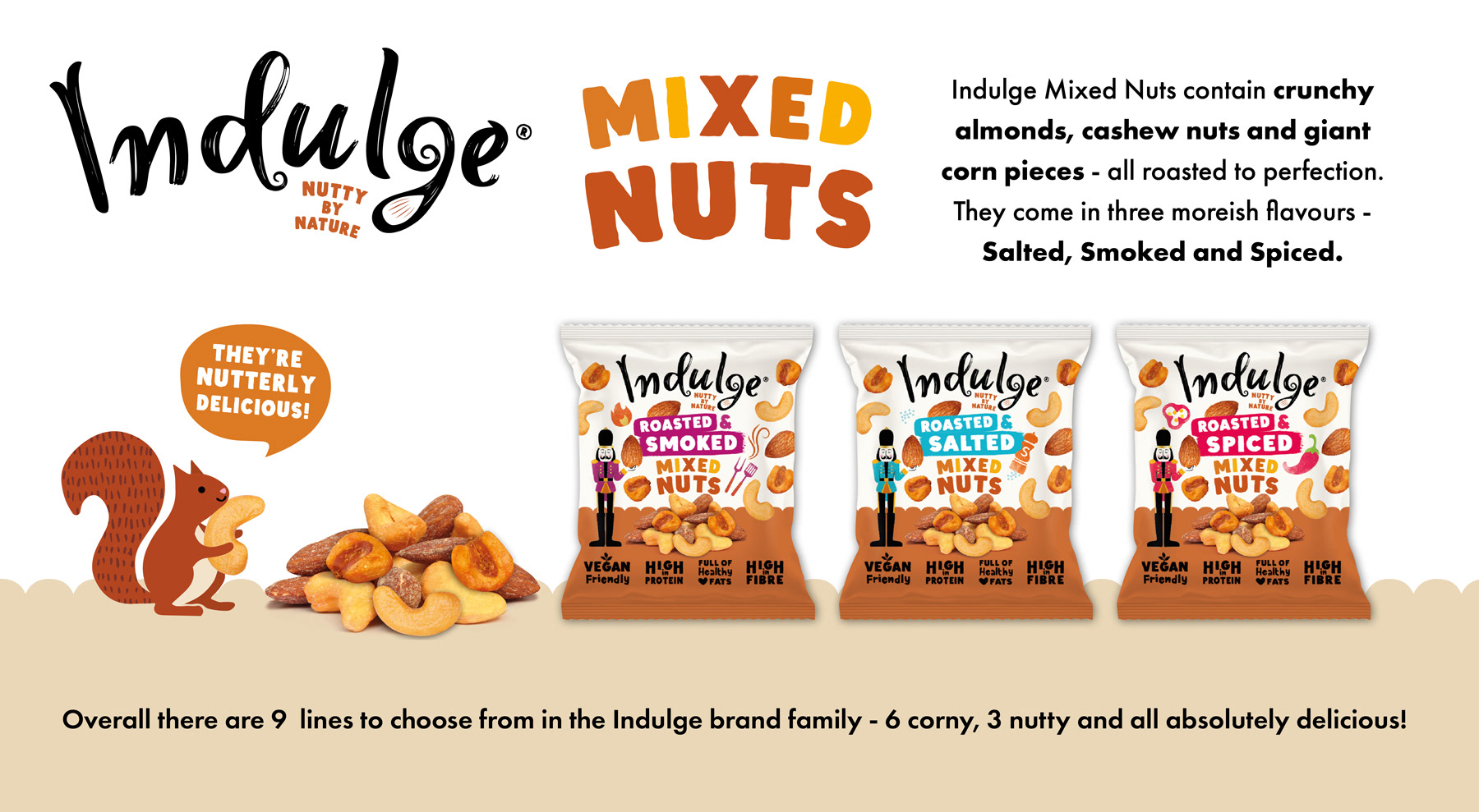 Following the success of Indulge's Corn Snacks launch, the team wanted to adapt the branding for a new product range of Indulge Mixed Nuts.